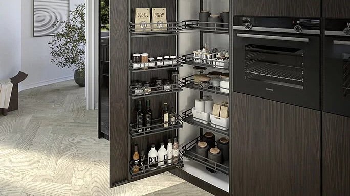 Interior fittings from Hettich’ guarantee maximum storage space with stylish looks and impressive ergonomics. The consistent concept can be customised and applied in a variety of ways, from classic internal pot-and-pan drawer to carefully considered tall and corner unit interiors. The fittings specialist offers numerous combinations, colour coordinated elements in anthracite pick up on the design of other Hettich products to create a perfectly balanced, overall look.
