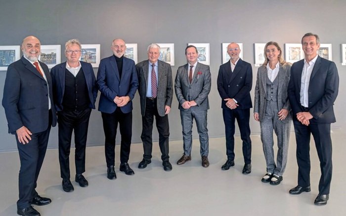 from left to right: Enrico Aureli, Chairman of Scm Group; Marco Mancini, CEO of Scm Group; Tecnest shareholders Fabio Pettarin, Mario Chientaroli and Giorgio P. Apolloni; Andrea Aureli, Vice President of Scm Group; Valentina Aureli, Board Member of Scm Group; and Giovanni Gemmani, Vice President of Scm Group. Photo - Scm Group.
